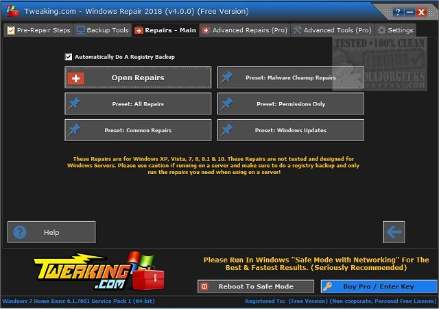 Tweaking.com - Windows Repair is an all-in-one repair tool to help fix a large majority of known Windows problems including registry errors and file permissions.