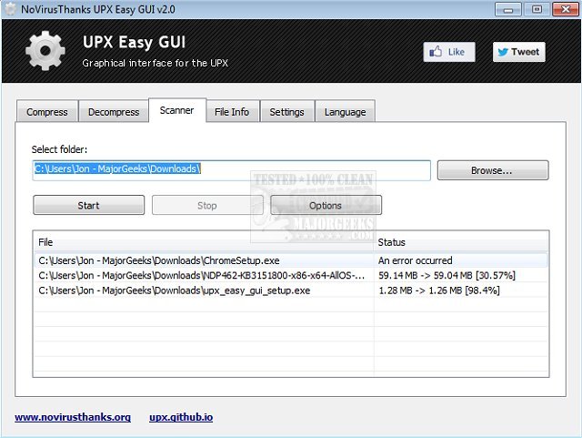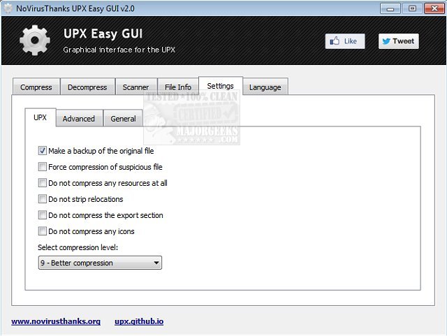 NoVirusThanks UPX Easy GUI enables easy compression/decompression of programs, DOS tools, DLLs, etc., with UPX and also supports various compression levels.