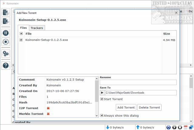 Koinonein BitTorrent Client is a fully featured BitTorrent Client designed to be free from data mining, spyware, and toolbars.