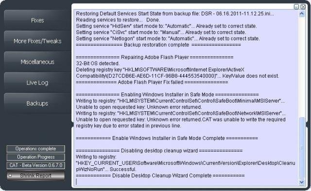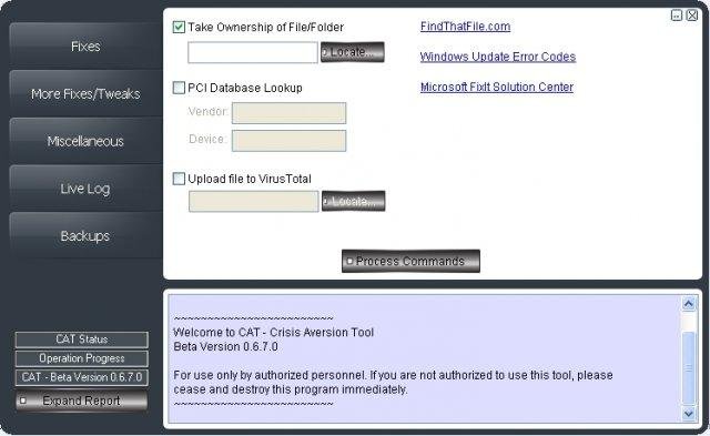 Crisis Aversion Tool aides in computer repairs with a large collection of commonly needed windows fixes, a full Restore Point Manager, research tools/links, and more.