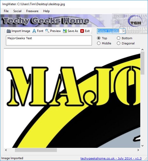 ImgWater is a free app to apply text watermarks to your BMP, EMF, EXIF, GIF, JPG, PNG, TIF, and WMF images.