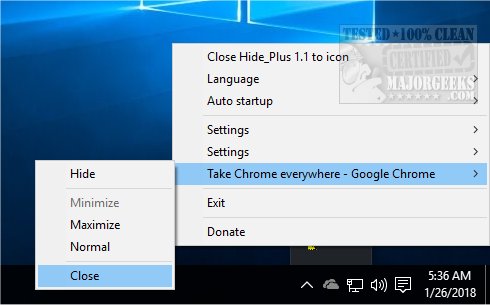 Hide_Plus allows you to hide open applications from the desktop, taskbar or system tray.