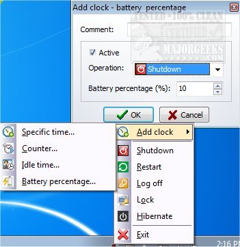 VCL Shutdown Clock allows you to setup multiple shutdown tasks including shutdown, restart, log off, lock and hibernate. It can also enable task execution depending on PC idle time as well as battery percentage.