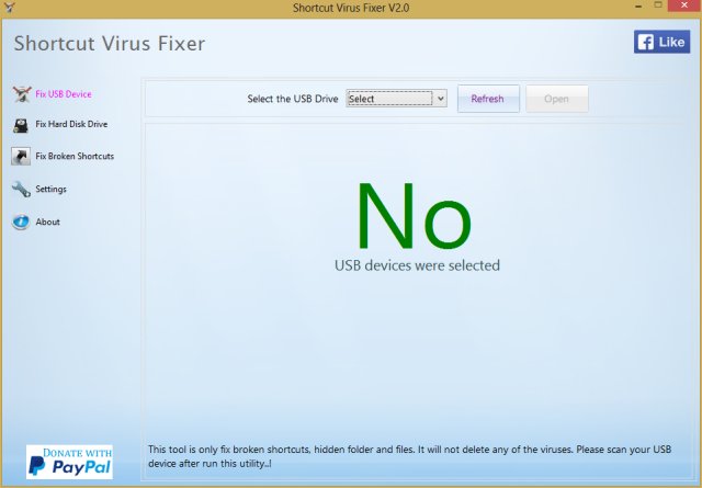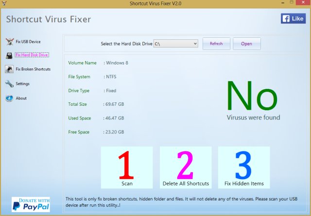Shortcut Virus Fixer, unlike its name, can scan your hard drives and USB drives when they are inserted as well as fix or delete broken and invalid shortcuts, and fix hidden items.