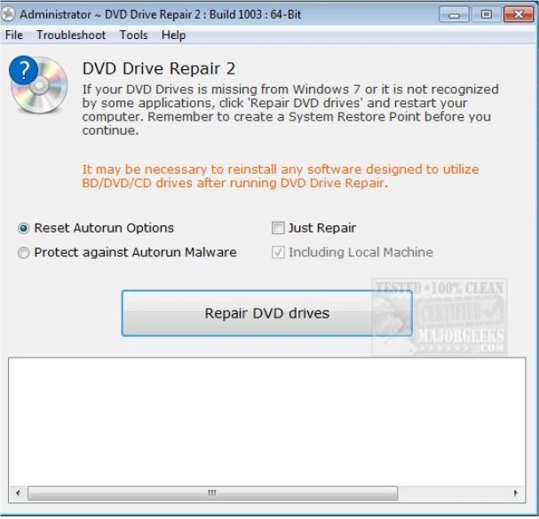 DVD Drive Repair Portable allows you to restore your DVD drive if it is missing from Windows or specific apps fail to recognize it due to hardware issues or a virus.