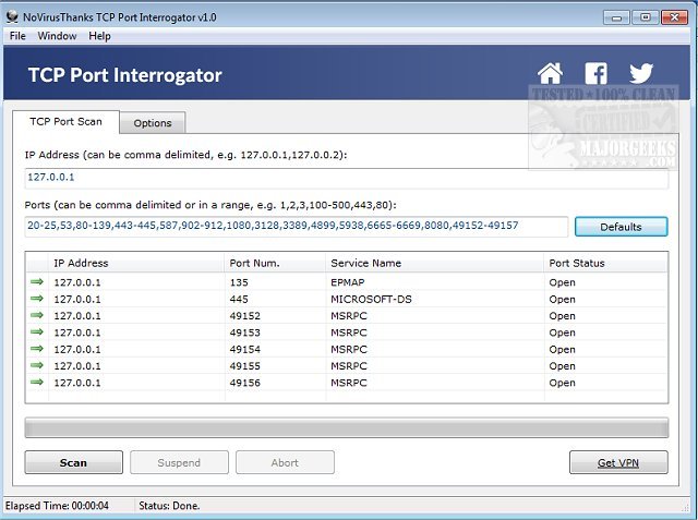 NoVirusThanks TCP Port Interrogator determines if a specific TCP port range is open or allows for a persistent connection on a remote target.