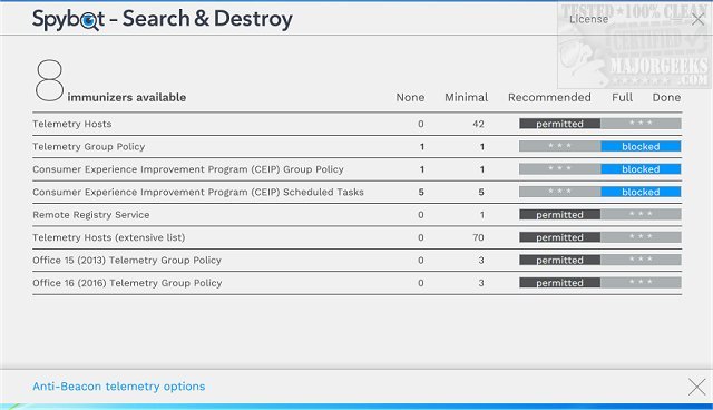 Spybot Anti-Beacon is a tool that will attempt to curtail Windows 10 from sending data back to Microsoft. Created by the developers of Spybot Search and Destroy.