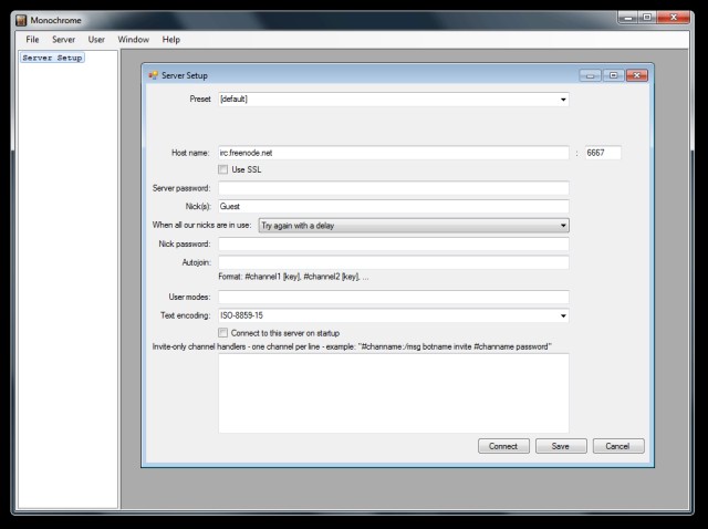 Monochrome is an IRC client intended for long-time IRC users with the goal of security, reliability, and stability despite IRC network failures or connectivity problems.