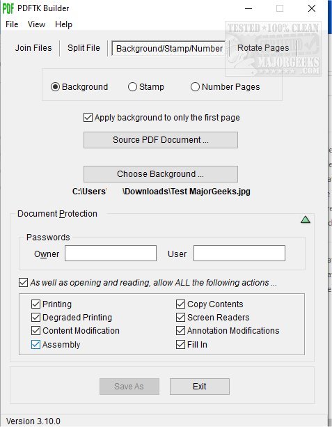 PDFTK Builder allows you to manage your PDF documents including the ability to merge or split pages; stamp pages or add background watermarks; add page numbers, and even rotate pages.