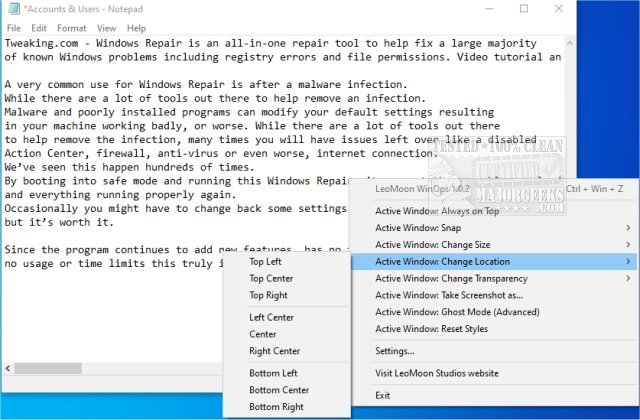 LeoMoon WinOps is a portable app for optimizing various window management activities through a simple popup menu utilizing a global hotkey.