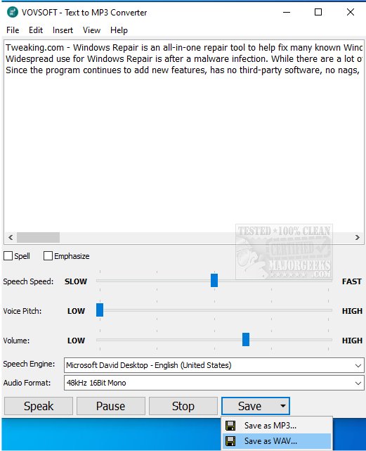 VOVSOFT Text to MP3 Converter allows you to convert text to speech and save it in WAV or MP3 formats.
