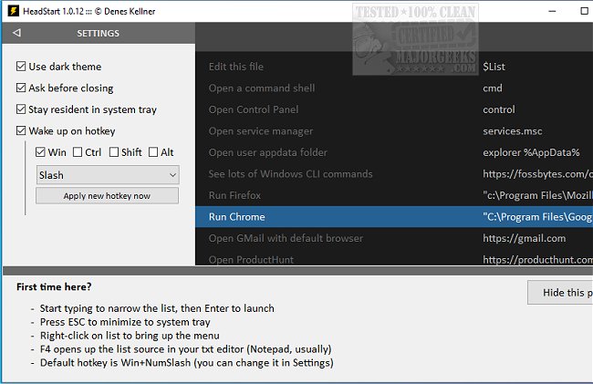 HeadStart allows you to launch various things, including running apps, opening URLs, command-line execution, and more.
