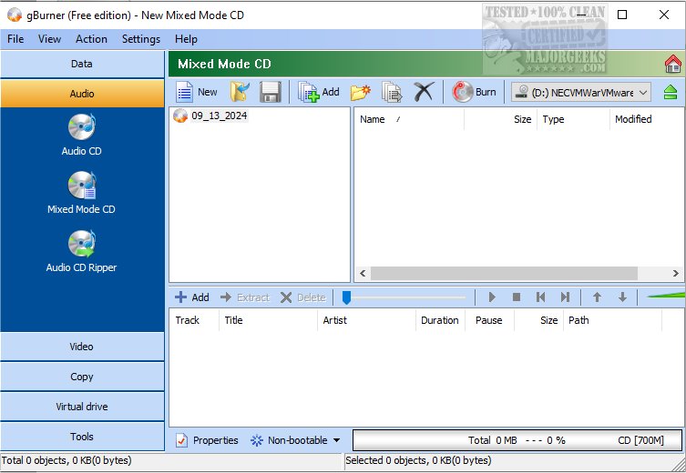 gBurner efficiently burns various discs, like CDs, DVDs, and Blu-ray.