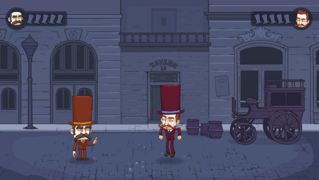 Two gentlemen battling each other with top hats and special pocket watches. Lose your hat and you lose your honor!